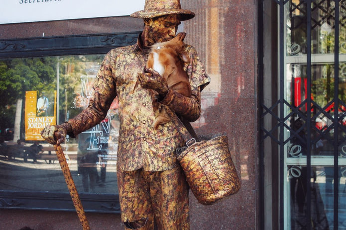 O Cineteatro São Luís, na Praça do Ferreira, é ponto conhecido pelos fortalezenses por toda a sua importância histórica e cultural. Mas de segunda à sexta, além de assistir filmes e peças teatrais, é possível também conhecer o trabalho de um jovem venezuelano que logo ali na frente impressiona quem passa pela perfeição e beleza do seu trabalho como estátua viva. Acompanhado sempre de sua fiel companheira, a cadela chamada Jaspe, Yorge Ruiz, de 26 anos, interpreta o papel de um pescador com um traje bem produzido e um cenário detalhado, encantando a todos os transeuntes do centro da cidade, desde 2015, com sua arte.